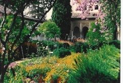 In Islamic Sicily and Spain the gardens of paradise were planted with exotic fruits such as oranges and bergamots and flowers such as asphodel and adorned with fountains where one heard the soothing spray or tinkle of running water while lounging on silken cushions ranged in order on richly spread carpets under the cool shade of broad-leaved trees. A peaceful repose in today's Alhambra palace in Granada or the al-Azim palace in Damascus makes this all clear.